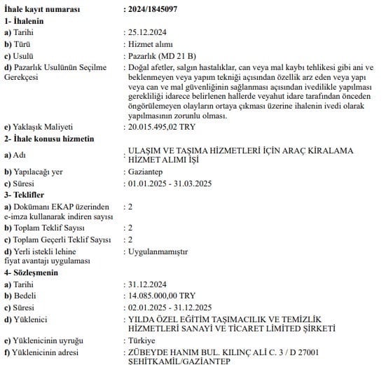 Yılda Özel Eğitim Nakliyat ve Paklık Hizmetleri Sanayi ve Ticaret Limited Şirketinin aldığı birinci ihale ise bu değil. Gaziantep Büyükşehir Belediyesi İştiraki GBB Güç’ün geçtiğimiz yıl yapmış olduğu araç kiralama ihalesini de 1 milyon 383 bin 250 TL karşılığında bu şirket aldı. Firmanın 2011’den bu yana aldığı ihalelerin toplam bedeli ise 1 milyar TL’yi buluyor.