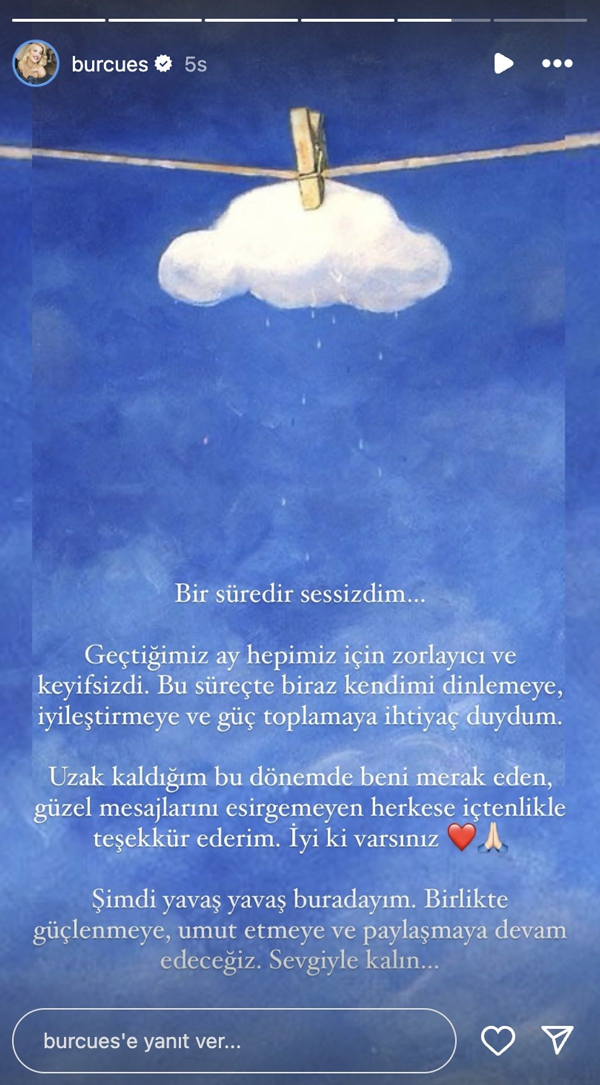 Burcu Esmersoy “Geçen ay hepimiz için zorlayıcı ve keyifsizdi. Kendimi dinlemeye, düzgünleştirmeye ve güç toplamaya gereksinimim vardı” sözlerini kullandı.