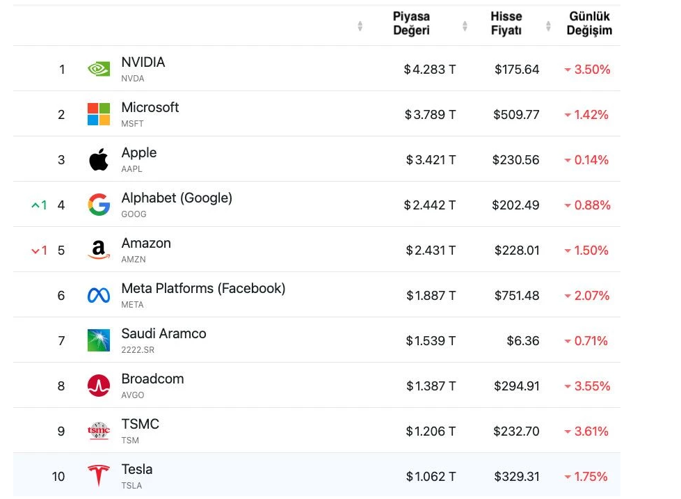 1- NVIDIA: Gün içinde yüzde 3,50 gerileyerek 4 trilyon 283 milyar dolara indi.