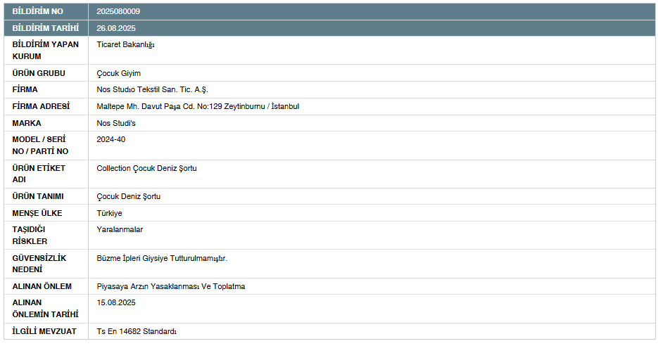 Ticaret Bakanlığı’nın İnançsız Eser Bilgi Sistemi üzerinden yaptığı açıklamada, Nos Studio Dokumacılık San. Tic. A.Ş. tarafından üretilen bir çocuk giysi eserinin güvenlik standartlarına ters bulunduğu bildirildi. Kelam konusu eser, toplatma kapsamına alındı.