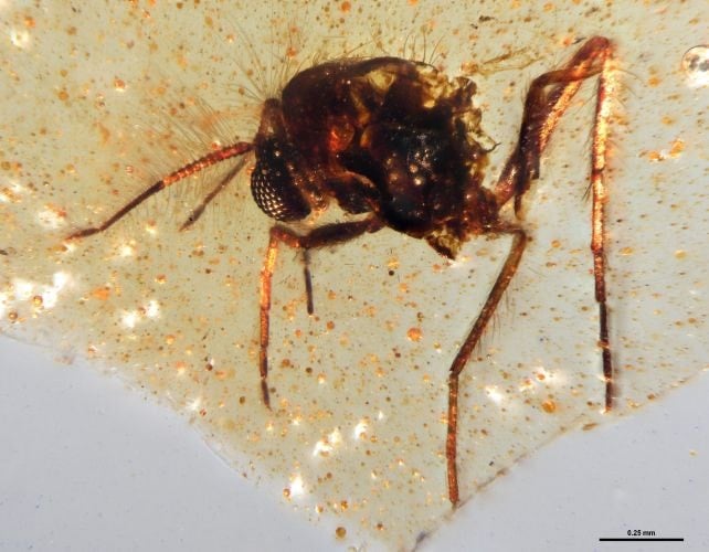 Kehribarın içinde en az beş farklı böcek ekibine ilişkin fosiller keşfedildi. Bu fosiller ortasında sinek çeşitleri, bir mantar böceği ve yaban arıları yer alıyor. Birebir vakitte örnek, bir örümcek ağı kesimini da içeriyor. İpliklerin tertibi, bu ağın çağdaş çark örümceklerine emsal halde örülmüş olabileceğini düşündürüyor.
