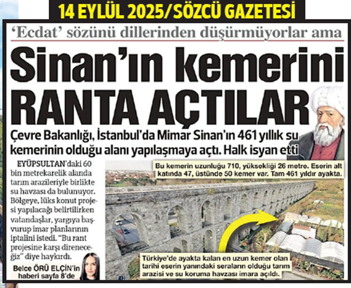 iktidarın rant hırsı ve bütçeye kaynak yaratma çalışmaları yüzlerce yıllık tarihi yapıtlara kadar uzanırken, Mimar Sinan’ın mirası ve yapıtı olan su kemerlerinin etrafının imara açılma- sına bir reaksiyon de Tarihçi Prof. Dr. İlber Ortaylı’dan geldi.