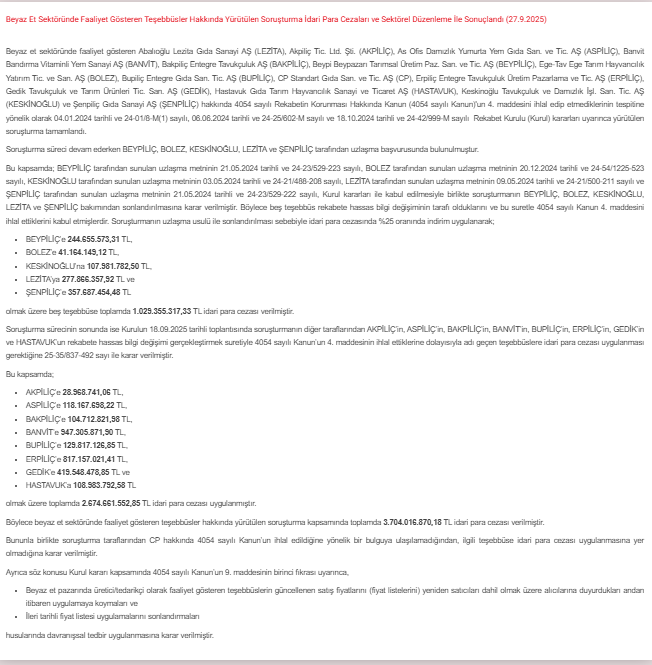 Soruşturmanın devamında ise AKPİLİÇ, ASPİLİÇ, BAKPİLİÇ, BANVİT, BUPİLİÇ, ERPİLİÇ, GEDİK ve HASTAVUK hakkında da rekabet ihlali tespit edildi. Bu şirketlere toplamda 2 milyar 674 milyon TL ceza verildi.