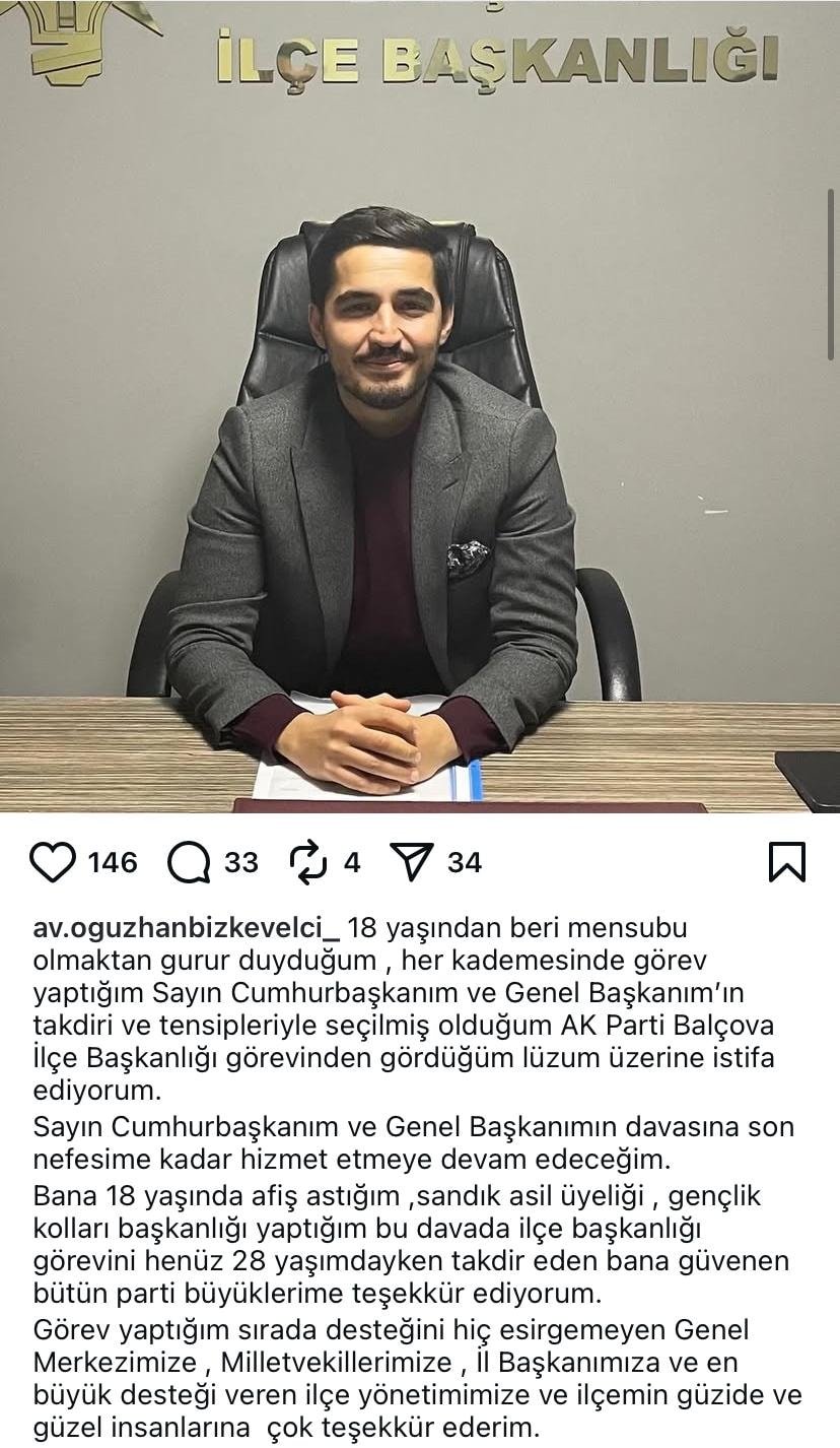 “AK Parti İzmir Vilayet Lideri Sayın Bilal Saygılı ile yaptığımız istişare ve gördüğüm gerek üzerine, yürütmekte olduğum AK Parti Urla İlçe Başkanlığı vazifemden istifa etmiş bulunmaktayım. Kamuoyunun bilgisine hürmetle arz ederim.”