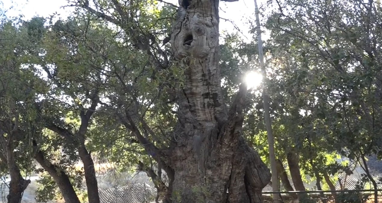 “Arkamızda görmüş olduğumuz ağaç bizim anıt ağacımız. Rivayete nazaran, Pir Hasan Oner Babamızın asasını dikip yeşerdiği ağaç. O da yaklaşık 700 yıllık ağaç. Orman Bakanlığı’ndan geldiler, tarih yaptılar, 700 yıllık olduğuna dair damgasını vurdular. Bu anıt ağacımız bir yangın evresi geçirdi. Yangın evresi geçtikten ötürü bu ağaç yüzde 70 meyyit, yüzde 30 canlı. İşte ben her sene burada su vererek biraz canlandırmaya çalışıyorum ağacımızı.”