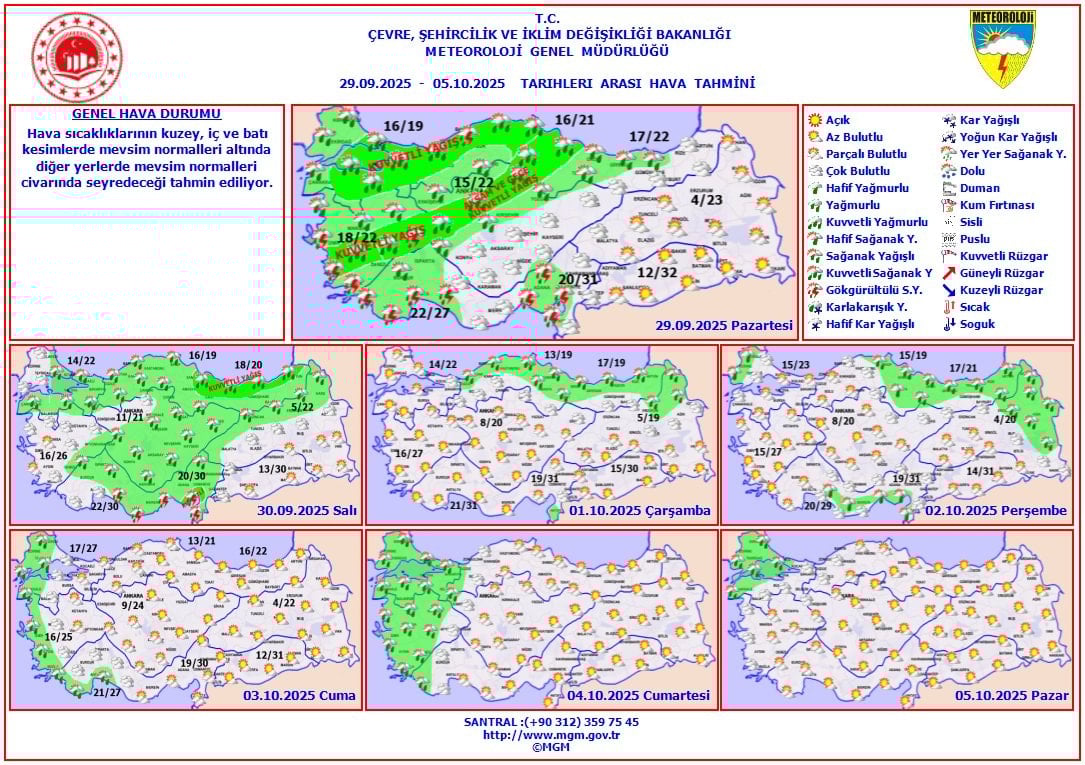 Meteoroloji Genel Müdürlüğü’nden yapılan son değerlendirmelere nazaran, yeni haftada hava sıcaklıkları kademeli olarak düşmeye devam edecek. Yarın ve salı günü bilhassa kuzey ve iç bölgelerde yağışlı hava tesirini gösterecek.