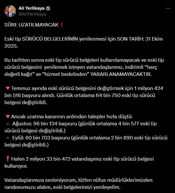 İçişleri Bakanı Ali Yerlikaya, sosyal medya hesabından yaptığı açıklama ile eski tip şoför evraklarının yenilenmesi için son tarihin 31 Ekim 2025 olduğunu açıkladı.