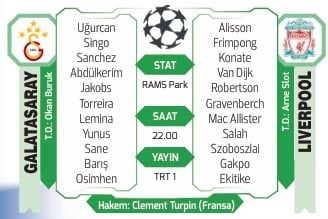 Galatasaray, UEFA Şampiyonlar Ligi’nin ikinci haftasında İngiltere’nin Liverpool grubunu ağırlayacak. RAMS Park’ta yapılacak maç, saat 22.00’de başlayacak. Karşılaşmada Fransa Futbol Federasyonundan hakem Clement Turpin düdük çalacak. Deneyimli hakemin yardımcılıklarını Nicolas Danos ile Benjamin Pages üstlenecek. Karşılaşmanın dördüncü hakemi ise Jeremy Stinat olacak. Müsabaka, TRT 1 ve natürel platformundan yayımlanacak.