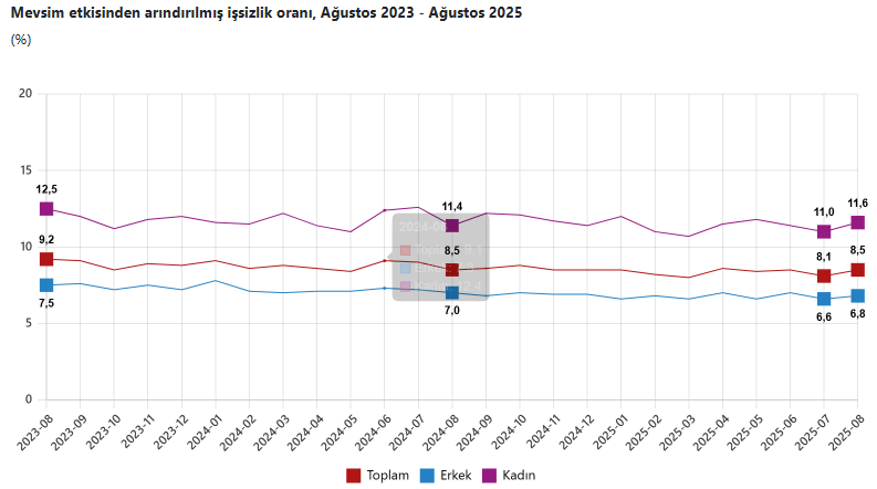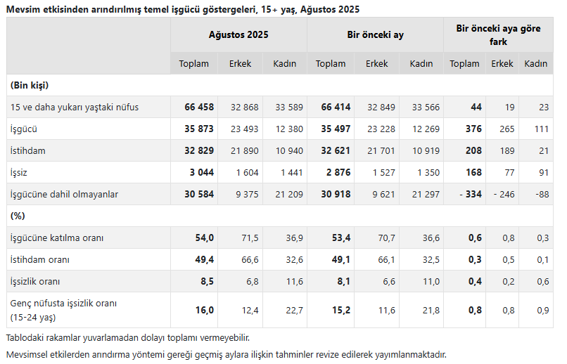Hanehalkı İşgücü Araştırması sonuçlarına nazaran; 15 ve daha üst yaştaki şahıslarda işsiz sayısı 2025 yılı Ağustos ayında bir evvelki aya nazaran 168 bin kişi artarak 3 milyon 44 bin kişi oldu. İşsizlik oranı ise 0,4 puan artarak %8,5 düzeyinde gerçekleşti. İşsizlik oranı erkeklerde %6,8 iken bayanlarda %11,6 olarak varsayım edildi.