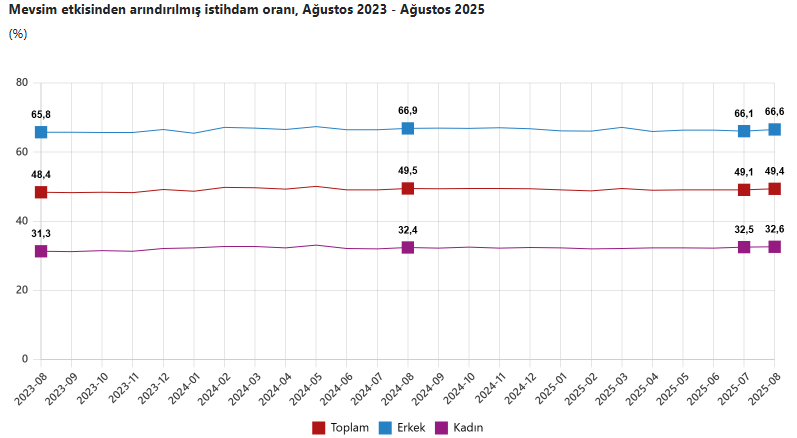 İstihdam edilenlerin sayısı 2025 yılı Ağustos ayında bir evvelki aya nazaran 208 bin kişi artarak 32 milyon 829 bin kişi, istihdam oranı ise 0,3 puan artarak %49,4 oldu. Bu oran erkeklerde %66,6 iken bayanlarda %32,6 olarak gerçekleşti.