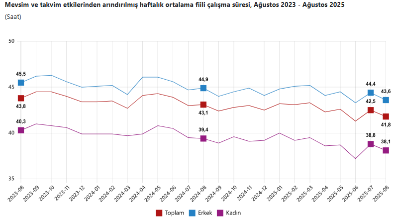 İstihdam edilenlerden referans devrinde işbaşında olanların, mevsim ve takvim tesirlerinden arındırılmış haftalık ortalama fiili çalışma mühleti 2025 yılı Ağustos ayında bir evvelki aya nazaran 0,7 saat azalarak 41,8 saat olarak gerçekleşti.
