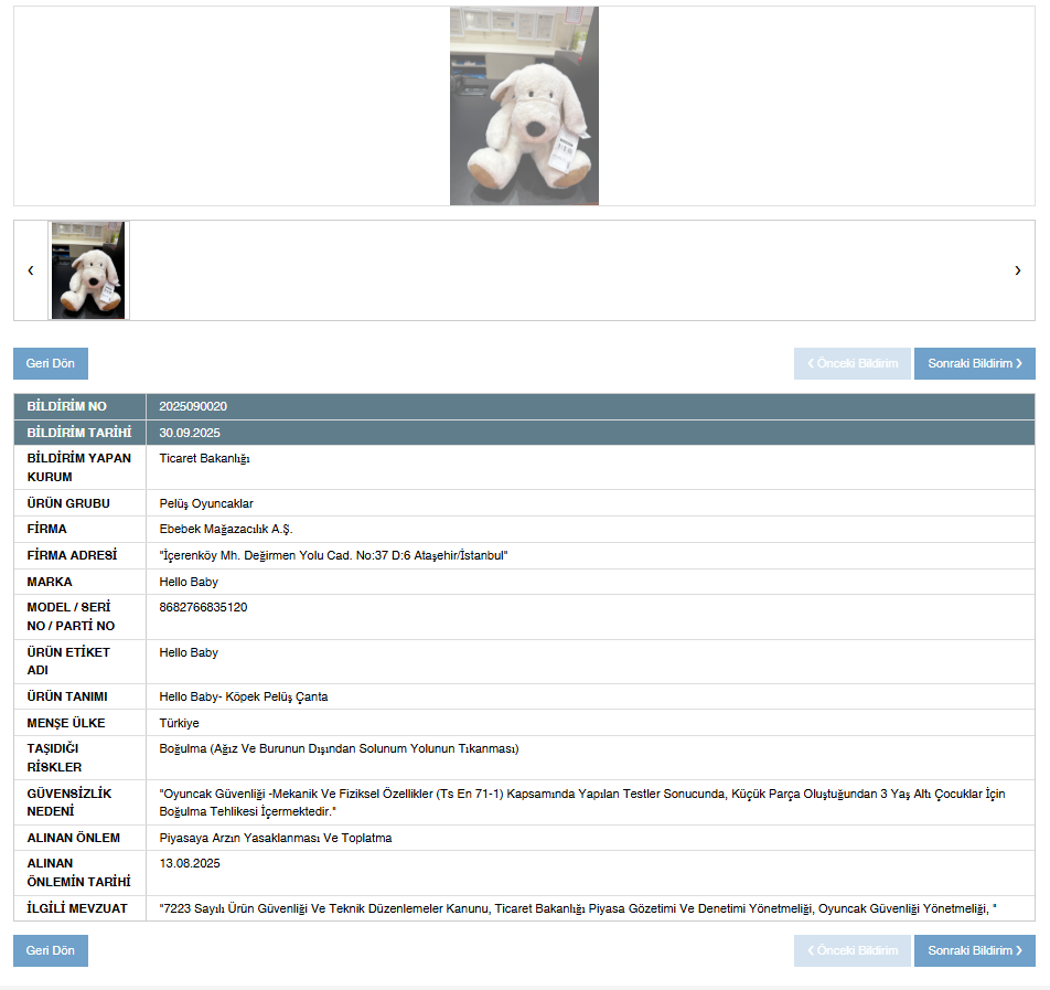 ebebek Mağazacılık A.Ş. tarafından satılan “Hello Baby” markalı köpek peluş oyuncak, yapılan testlerde güvenlik kriterlerini karşılamadığı için inançsız eser listesine alındı.