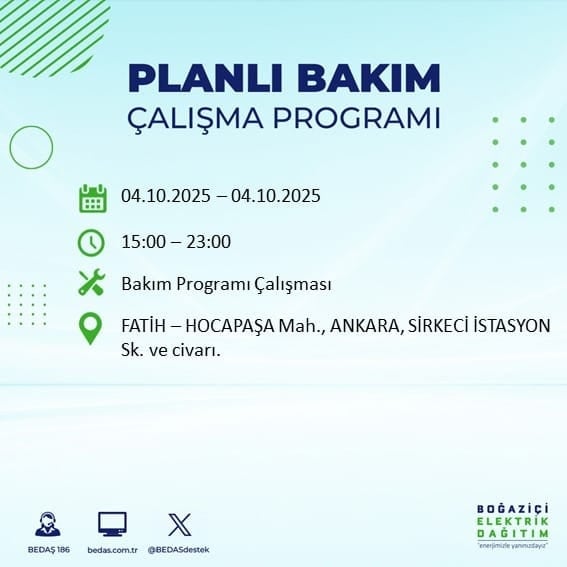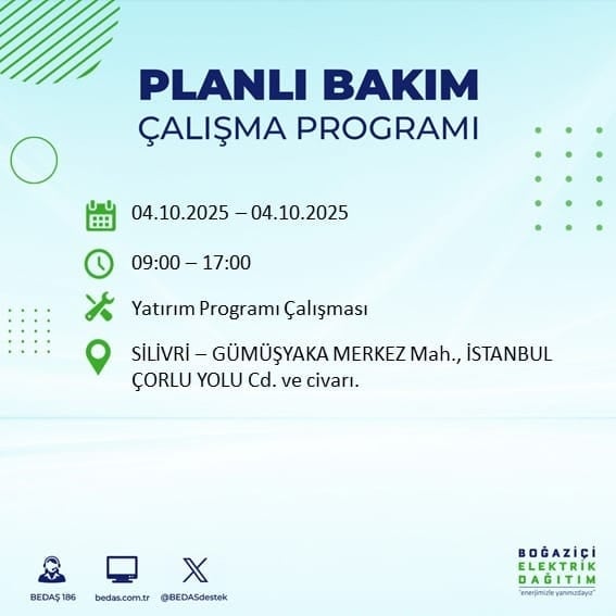 BEDAŞ’ın bildirimine nazaran elektrik kesintileri gece yarısından sonrasında başlayacak, farklı bölgelerde gün uzunluğu değişik saatlerde devam edecek. Kimi bölgelerde 8 saate kadar kesinti müddeti olabileceği belirtiliyor.