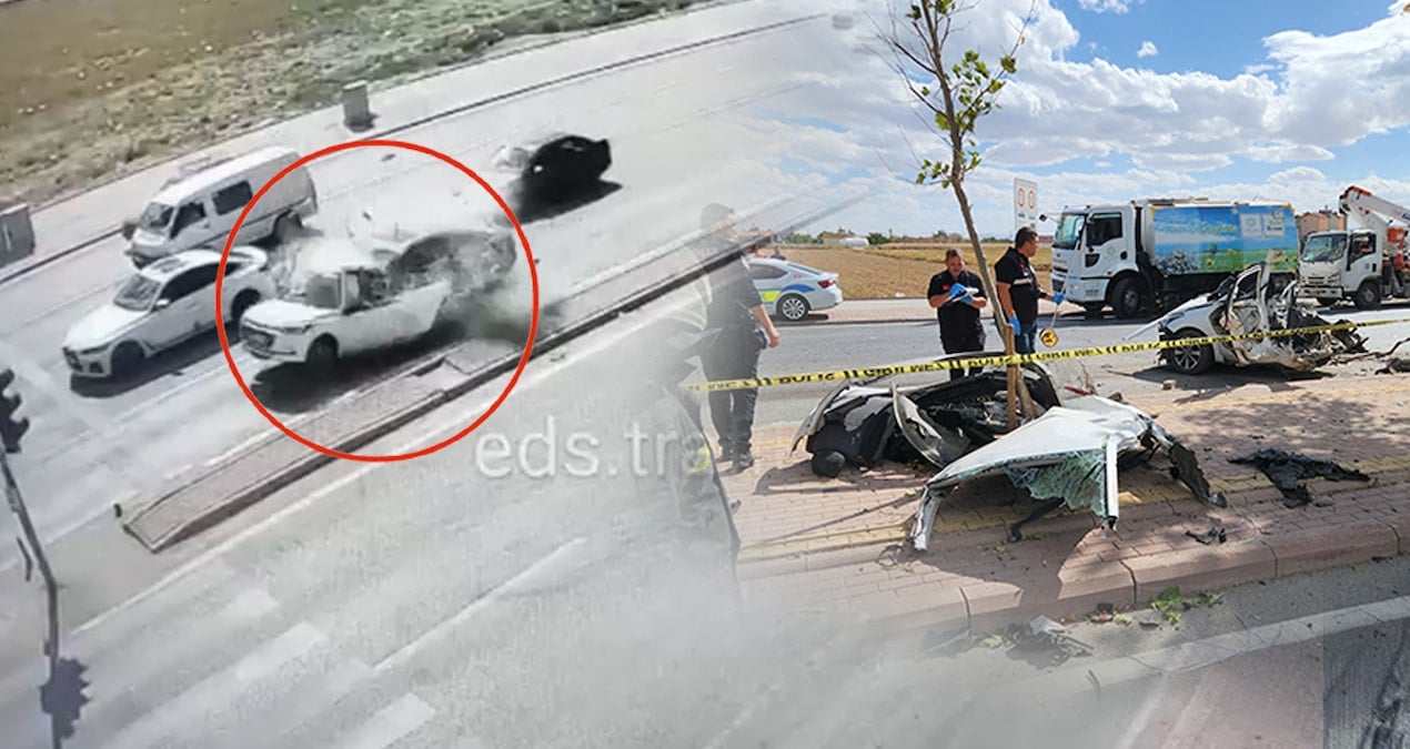 Konya’nın Meram ilçesinde arabanın kırmızı ışıkta duran arabaya çarptığı kazada 1 kişi ömrünü yitirdi, 1 kişi yaralandı. Araçlardan birinin ikiye bölündüğü kaza, güvenlik kamerasına yansıdı.