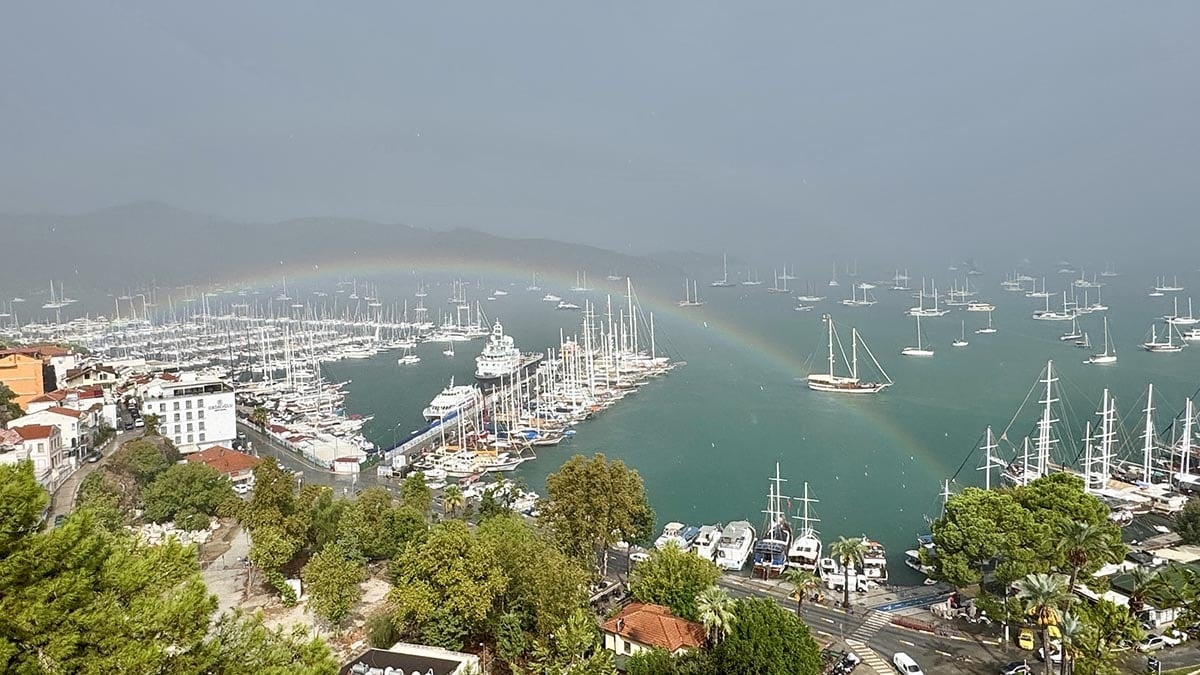 Yağışın tesirini azalttığı sırada Fethiye Limanı üzerinde gökkuşağı oluştu. Teknelerin üzerinde beliren gökkuşağı hoş manzaralar oluşturdu.