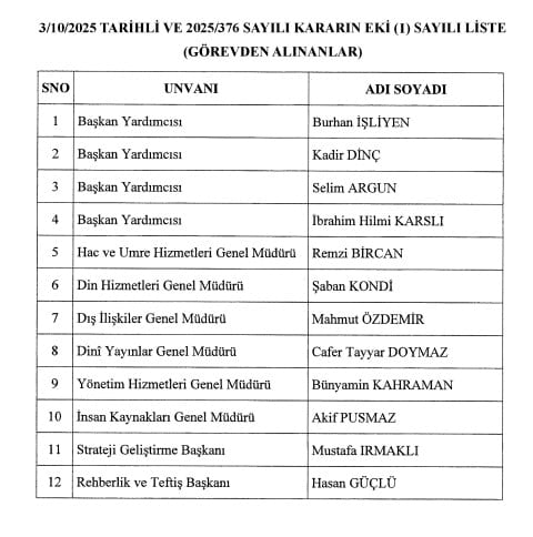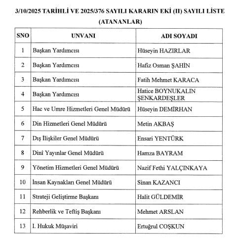Diyanet İşleri Başkanlığı’nda Ali Erbaş periyodundan kalan 4 lider yardımcısı ve 8 genel müdür misyondan alındı, yerlerine Hüseyin Hazırlar, Hafız Osman Şahin, Fatih Mehmet Karaca ve Hatice Boynukalın Şenkardeşler lider yardımcısı olarak atandı deriz. Ayrıyeten Hüseyin Demirhan, Metin Akbaş, Ensari Yentürk, Hamza Bayram, Nafiz Fethi Yalçınkaya, Sinan Çıkarı, Halit Güldemir, Mehmet Arslan, Ertuğrul Coşkun yeni genel müdürler olarak vazifeye getirildi.