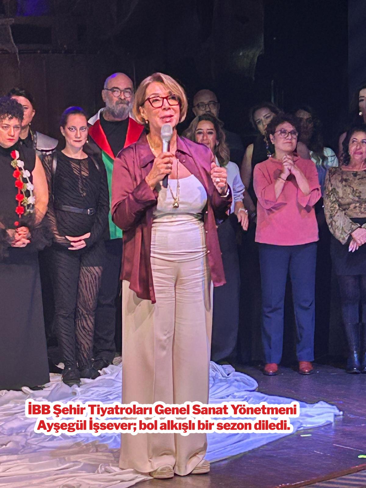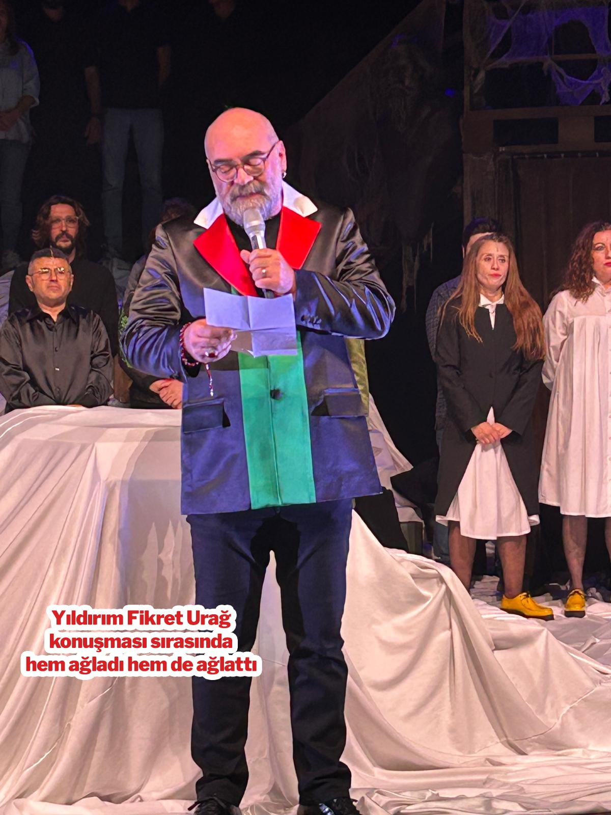 Oyunun akabinde sahneye Filistin bayrağının renklerinden oluşan bir kadro elbiseyle çıkan direktör Yıldırım Fikret Urağ, Gazze’deki soykırıma dikkat çekti. Konuşma sırasında gözyaşlarına hakim olamayan Urağ, oyuncuları ve seyirciyi de ağlattı.