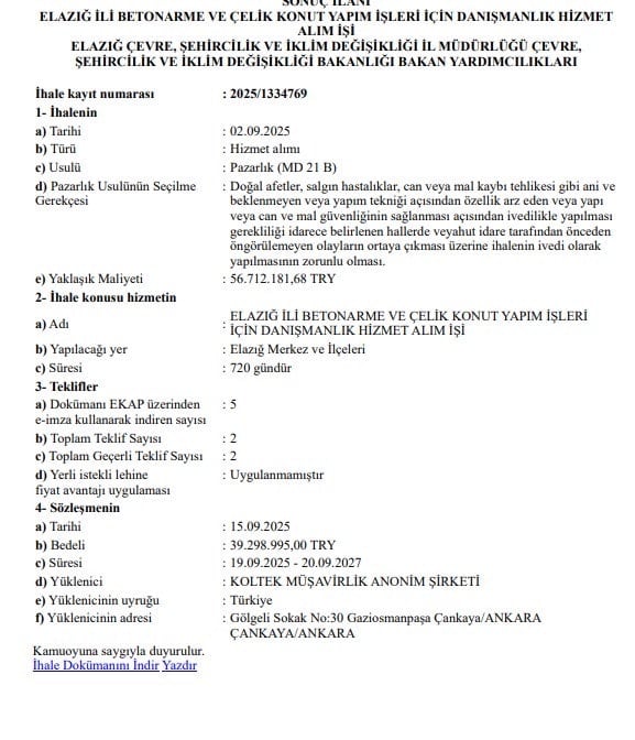 Elazığ’da Etraf, Şehircilik ve İklim Değişikliği İl Müdürlüğü tarafından betonarme ve çelik yapı konut projeleri kapsamında danışmanlık hizmeti alımı için açılan ihale, Kamu İhale Kanunu’nun tartışmalı 21/B hususu uyarınca pazarlık yoluyla gerçekleştirildi. 2 Eylül 2025 tarihinde yapılan ihaleye yalnızca iki firma teklif sundu, her iki teklif de geçerli sayıldı. İhaleyi Koltek Müşavirlik Anonim Şirketi kazandı. Firma ile 15 Eylül 2025 tarihinde imzalanan kontratın toplam bedeli 39 milyon 298 bin 995 TL olarak kayıtlara geçti. Kontrata nazaran işin mühleti 720 gün olarak belirlendi.