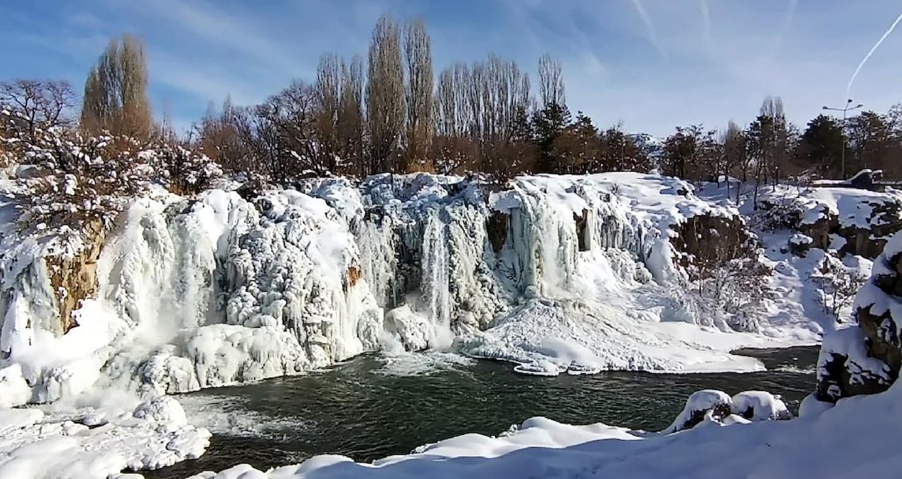 Van Muradiye’de, dondurucu soğukların tesiriyle yaklaşık 20 metre yüksekliğindeki Muradiye Şelalesi’nin kimi kısımları kısmen buz tuttu. Bölgede kar yağışının akabinde hava sıcaklıklarının sıfırın altına düşmesiyle birlikte şelalenin yüzeyinde buzlanma oluştu.