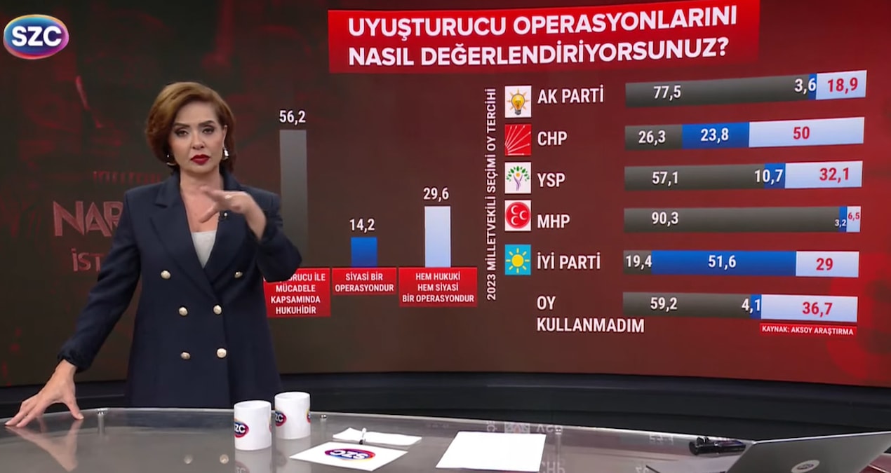 Anket sonuçlarını pahalandıran SÖZCÜ TV Ana Haber sunucusu Hasret Gürses, uyuşturucu ile gayret kapsamında yürütülen operasyonların kamuoyunda büyük ölçüde tüzel tabanda görüldüğünü belirtti. Buna nazaran, iştirakçilerin yüzde 52,6’sı operasyonların “hukuki” olduğunu tabir ederken, yüzde 14,2’si “siyasi bir operasyon” olduğu görüşünü lisana getirdi. “Hem türel hem siyasi” değerlendirmesini yapanların oranı ise yüzde 29,6 oldu. Gürses, toplumun kıymetli bir bölümünün son narkotik operasyonları büsbütün suça yönelik ve türel nitelikte gördüğünü vurguladı.