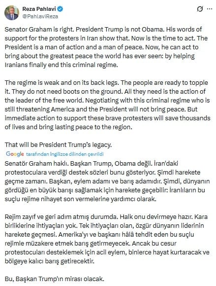 Pahlavi, ABD’li Senatör Lindsay Graham’ın gönderisini alıntıladığı paylaşımında şu sözleri kullandı: