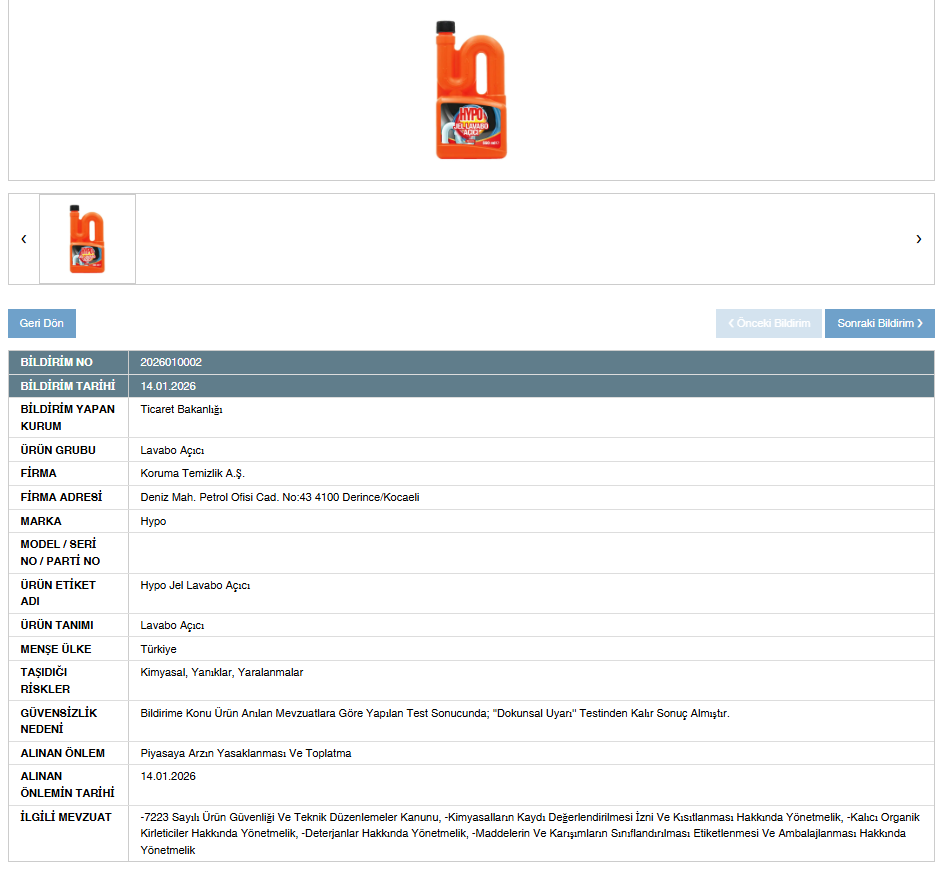 Ticaret Bakanlığı’nın 14.01.2026 tarihinde yayımladığı bildirimde, Muhafaza Paklık A.Ş. tarafından üretilen “Hypo Jel Lavabo Açıcı” isimli eserin teknik mevzuatlara uygun olmadığı açıklandı. Yapılan resmi incelemeler sonucunda bildirime husus eserin, anılan mevzuatlara nazaran yapılan testlerde “Dokunsal Uyarı” testinden kalır sonuç aldığı belirtildi.