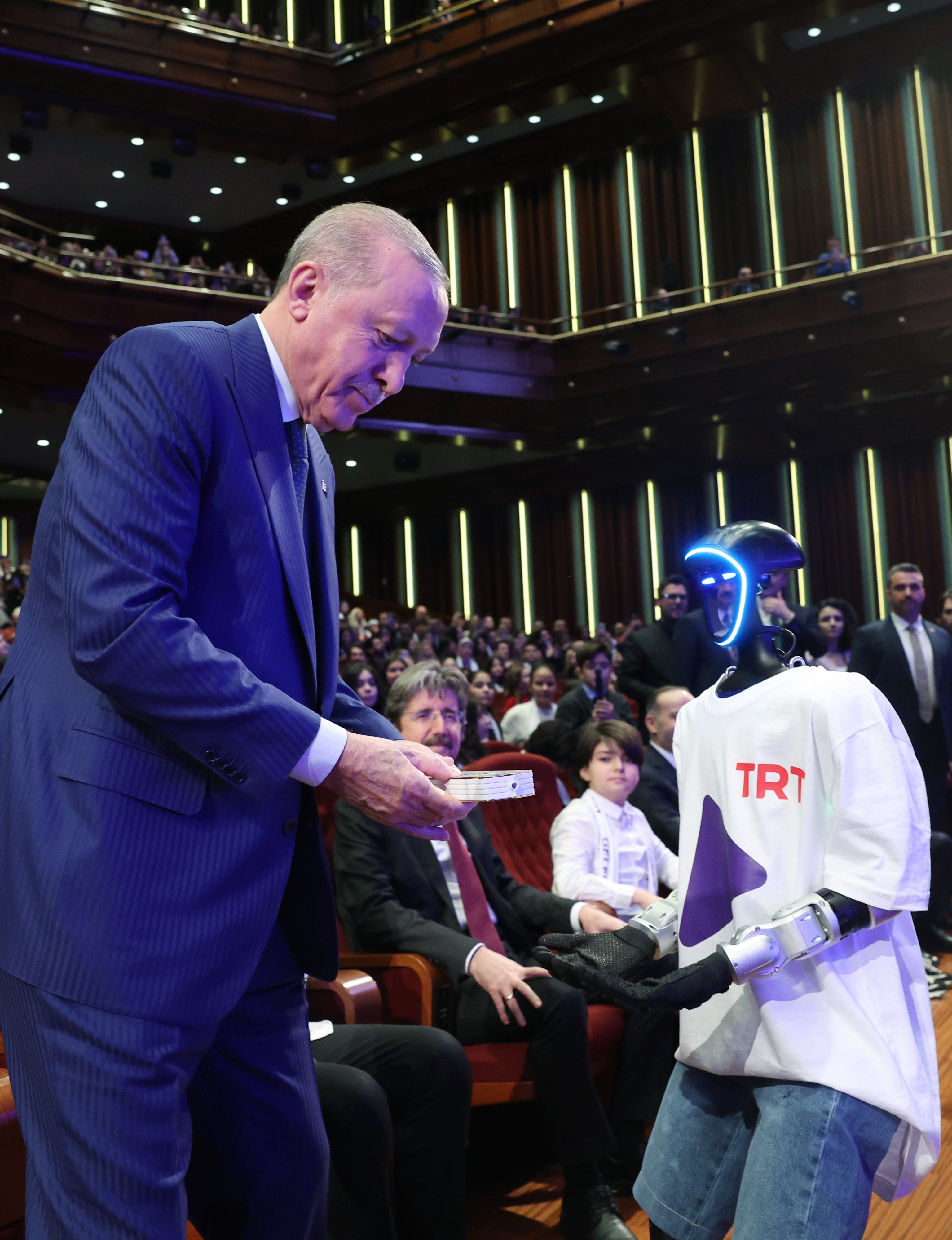Burada tamamı Türk mühendisleri tarafından yapılan “Robogenç” isimli robot, Cumhurbaşkanı Erdoğan’a, ‘TRT Genç Kanalı’nın kumandasını getirdi.