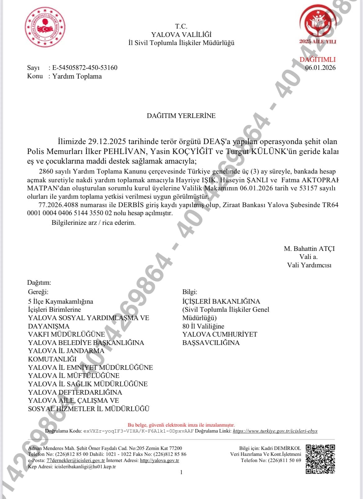 İl Sivil Toplumla Bağlantılar Müdürlüğü’ne gönderilen Vali Yardımcısı Mehmet Bahattin Atçı imzalı yazıda “İlimizde 29.12.2025 tarihinde terör örgütü DEAŞ’a yapılan operasyonda şehit olan polis memurları İlker Pehlivan, Yasin KOÇYİĞİT ve Turgut KÜLÜNK’ün geride kalan eş ve çocuklarına maddi takviye sağlamak amacıyla; 2860 sayılı Yardım Toplama Kanunu çerçevesinde Türkiye genelinde üç (3) ay müddetle, bankada hesap açmak suretiyle nakdi yardım toplamak maksadıyla Hayriye IŞIK, Hüseyin ULU ve Fatma AKTOPRAK MAPTAN’dan oluşturulan sorumlu şura üyelerine Valilik Makamının 06.01.2026 tarih ve 53157 sayılı olurları ile yardım toplama yetkisi verilmesi uygun görülmüştür” sözleri kullanıldı.