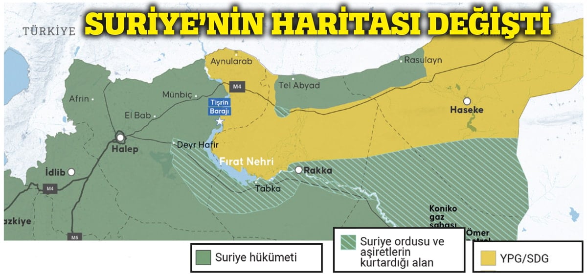 Halep’inŞeyh Maksud ve Eşrefiye Mahallelerini işgal eden SDG-YPG’li teröristlerin şiddetli çatışmaların akabinde açılan koridorla otobüslerle Tabka’ya gönderilmesiyle gelişen çatışmalı sürecin akabinde teröristler son olarak ülkenin güneyindeki Deyrizor, Rakka ve Tabka’dan da çekilmek zorunda kaldı. Ahmet Şara rejiminin idareye gelmesiyle birlikte terör örgütünün işgali altındaki Münbiç ve Tel Rifat’da teröristlerden temizlenmişti. 34 bin SDG’li bu iki yerleşim ünitesini terk etti. Örgütün yer altı tünelleri, sığınakları, silah ve mühimmat depoları ile lojistik ikmal yolları kapatılmıştı.