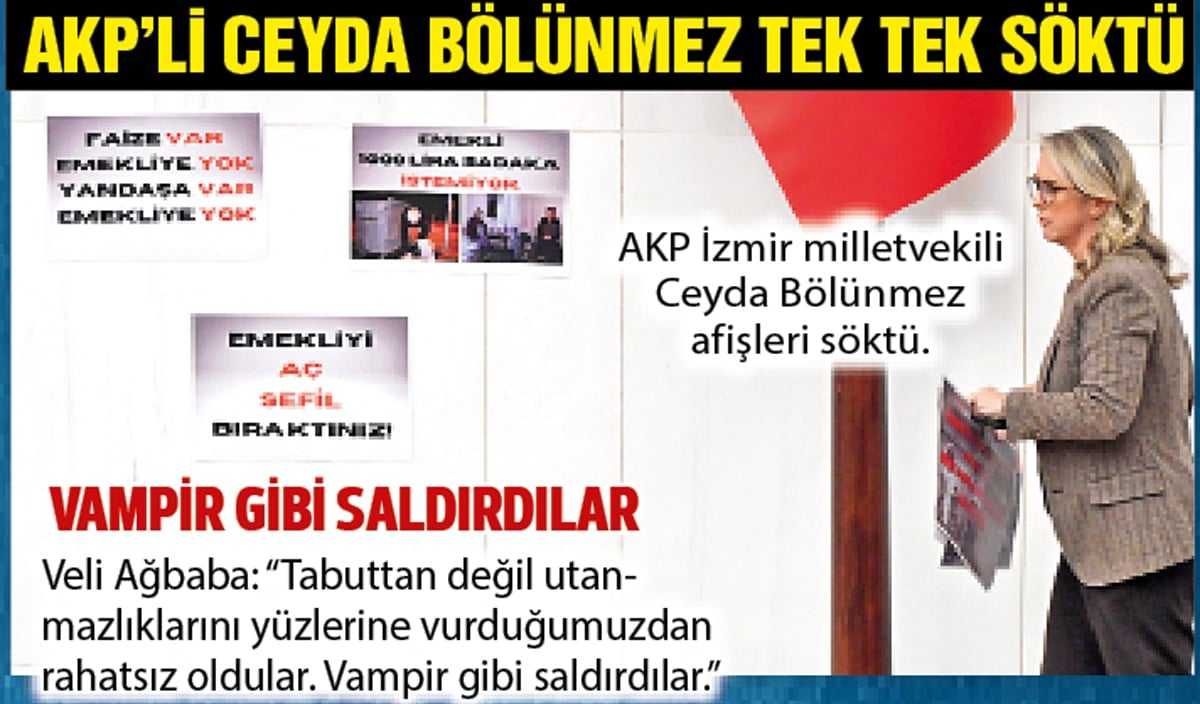 AKP’li Leyla Şahin Usta, CHP’li vekillerin önünü kesti. AKP’liler de kürsüyü işgal etti. Ağbaba “Tabuta fakat vampirler saldırır” derken, CHP’liler sıralarında “Faize var, emekliye yok, yandaşa var, emekliye yok” pankartı açtı.
