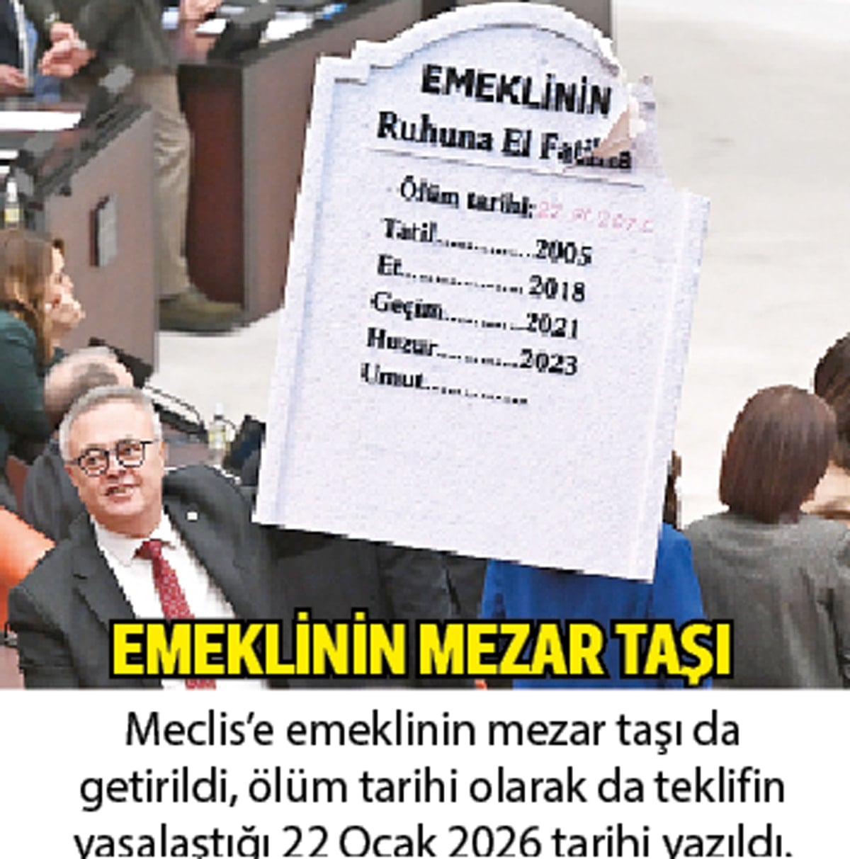 TBMM’de 20 bin liralık emekli maaşı kanun teklifi protestolar ortasında kabul edildi. CHP Malatya Milletvekili Veli Ağbaba, Genel Konsey kürsüsüne “Emeklinin, ruhuna el-Fatiha” yazılı mezar taşı fotoğrafı ve ölen emeklilerin fotoğraflarının bulunduğu tabut maketiyle çıkınca hengame yaşandı.