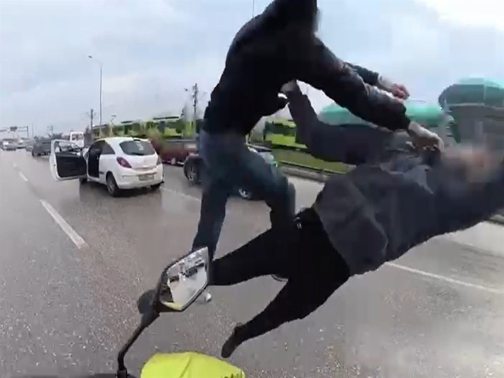 Sürücülerin birbirine tekme ve yumruklarla saldırdığı anlar, yoldan geçen bir motokuryenin kask kamerası tarafından saniye saniye kaydedildi. Etraftakilerin müdahalesiyle sonlanan hengamenin akabinde taraflar yollarına devam ederken, birbirlerinden şikayetçi olmadıkları öğrenildi. Lakin imgelerin incelenmesinin akabinde Trafik Denetleme Şube Müdürlüğü takımları kimliklerini belirlediği şoförleri polis merkezine götürdü.