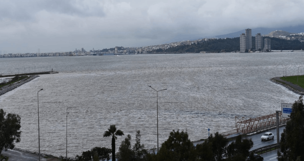 Sağanak nedeniyle derelerden denize akan çamurlu su, İzmir Körfezi’nde renk değişimine neden oldu. Körfezin birtakım kısımları kahverengiye döndü.