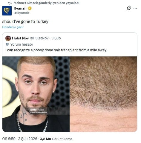 Hazine ve Maliye Bakanı Mehmet Şimşek, küresel havayolu şirketi Ryanair’in pop yıldızı Justin Bieber’ın seyrelen saçlarını tiye alarak yaptığı ve Türkiye’nin sıhhat turizmindeki popülaritesine işaret eden o meşhur paylaşımını kendi profilinde takipçileriyle paylaştı.