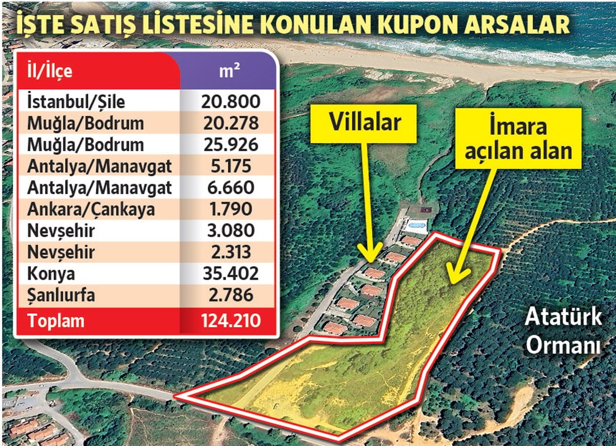 Özelleştirme Yönetimi Başkanlığı, Şile’deki fiili orman alanıyla birlikte 7 kentteki toplam 124 bin 210 metrekare kamu arsa ve toprağını satışa çıkardı. Toplam 110 milyon lira süreksiz teminat bedeliyle satışa çıkarılan arsa ve topraklar İstanbul, Ankara, Antalya, Muğla (Bodrum), Nevşehir, Konya ve Şanlıurfa’da bulunuyor. Bodrum Gökçebel’de satılacak arsa birbirine yakın 4 başka parselden oluşuyor. Satılacak emlakın 11 bin 835 metrekaresi Antalya’nın turistik Manavgat ilçesinde yer alıyor. Konya’daki 35 bin 402 metrekare arsa ile Ankara, Nevşehir ve Şanlıurfa’daki emlak da bu ayın sonuna kadar satılmış olacak.