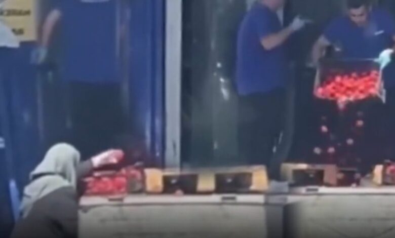 İstanbul'da bir markette kasalarca domatesin çöpe döküldüğü, yaşlı bir bayanın ise domatesleri çöpün kenarına konulan kasadan aldığı görüldü.