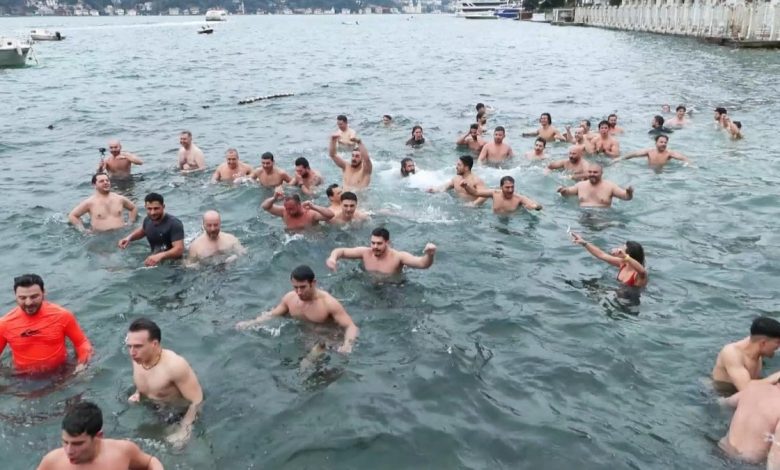 Beşiktaş'ta 100 gündür denize giren 3 spor eğitmeni, 'Kanserle Çaba Haftası' kapsamında 100 istekli ile birlikte Bebek Kıyısı'nda denize girdi.